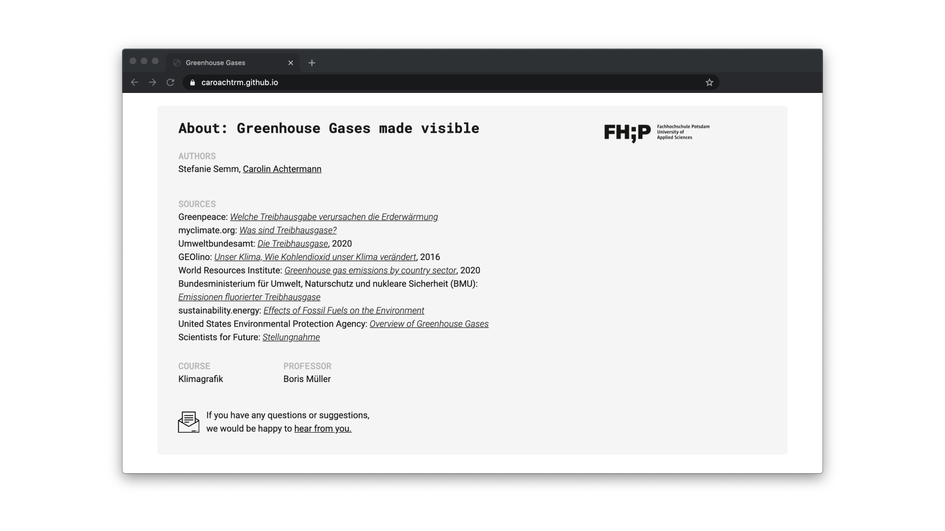 Our project was part of the course „Klimagrafik“, in which we developed infographics that illustrate and communicate ecological, economic, physical and social aspects of global warming. The infographics are published in the form of a website. The aim is to inform and educate about different aspects of climate change.