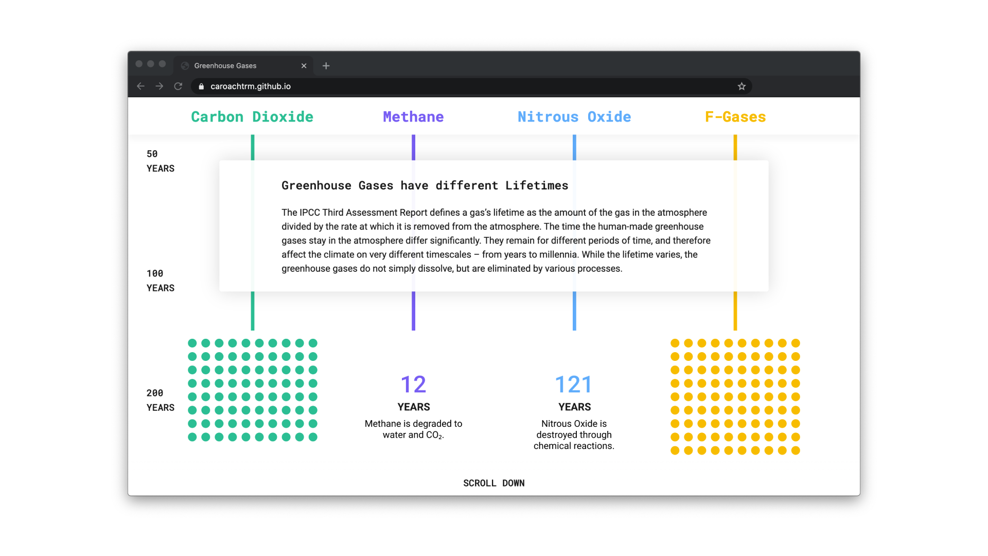 The final Website is a one pager with a few scrollytelling parts, where infovisualizations are animated. The usage of dots is a basis for most of our visualizations, which comes from an early sketch to explain the CO₂-Equivalents. Another main part is the 4-column-layout we are using for the whole website up to the conclusion part. That means we have one column for each gas, a sticky Header shows which gas is represented where on the side and all information about each gas is in this layout.