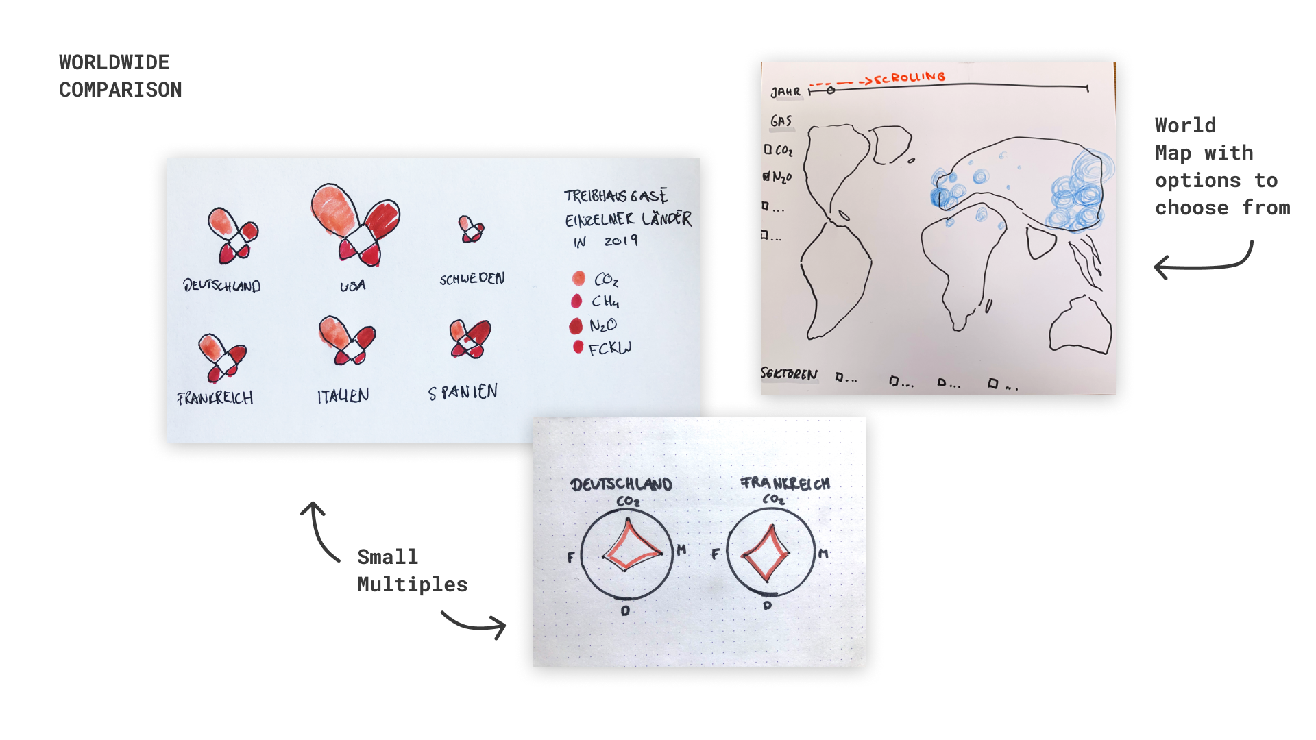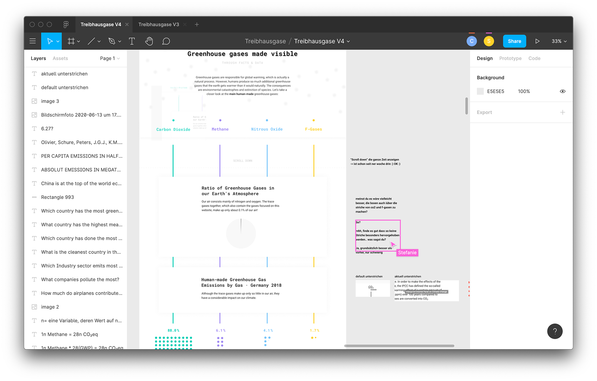 We started by sketching a lot of ideas and visuals for the visualizations and how we could communicate and explain the complexity of the CO₂-Equivalents. Then we built screens and designs in figma. Stefanie created the style guide quite early, having 4 colors for each gas, the Roboto Mono for Headers and the Roboto for texts. We both did research to write all texts and discussed the layout. Finally I started coding the website, using static HTML, CSS and JavaScript. After every coding step I pushed the code to GitHub, from where I also launched the page. In the last 3 weeks of working on the project, we had several design and code iterations to optimize the reading flow.