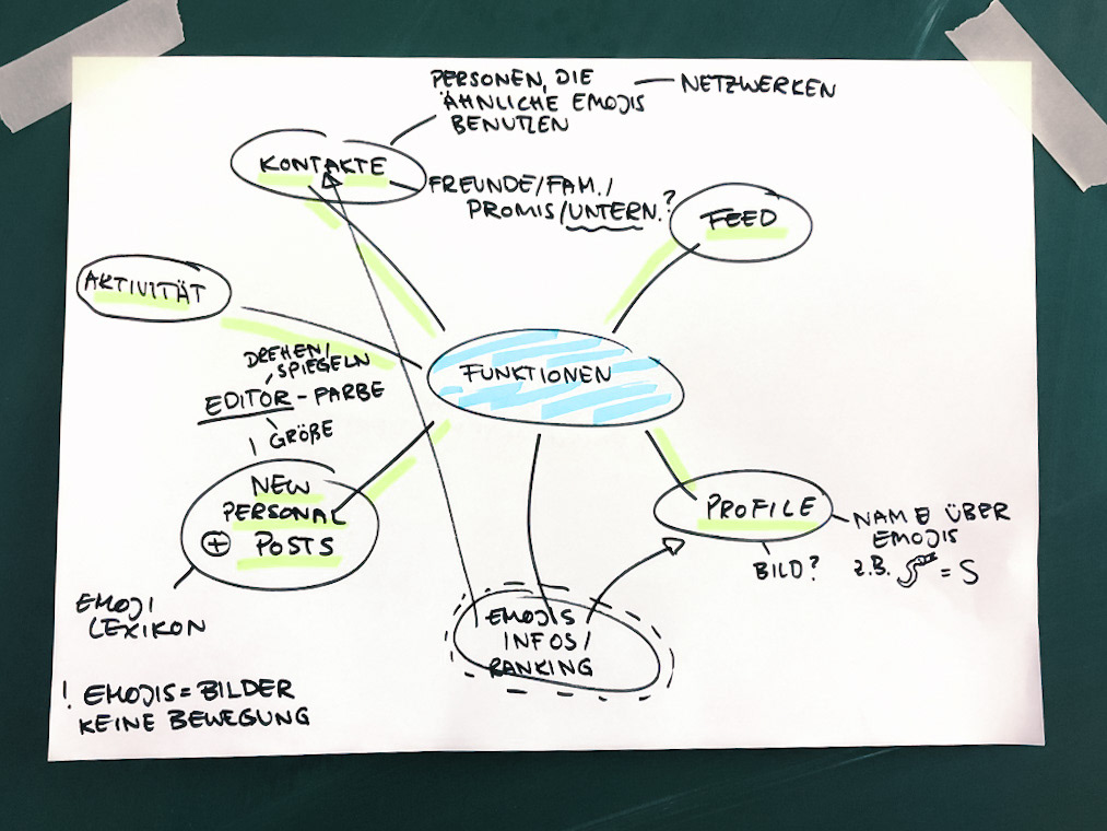 First, we developed a functional mind map in which we outlined all features of our idea. But these scribbles only contained standard interface elements and we wanted to think outside the box and create an alternative interface.